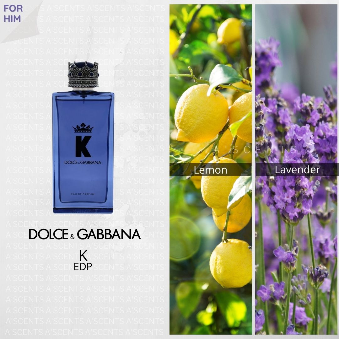 K by Dolce & Gabbana Eau de Parfum by Dolce&Gabbana is a Woody Spicy fragrance for men. This is a new fragrance. K by Dolce & Gabbana Eau de Parfum was launched in 2020. Top notes are lemon, sicilian lemon, blood orange, cardamom, juniper berries and pimento; middle notes are geranium, clary sage, lavender and fig nectar; base notes are cedar, patchouli, vetiver and cypriol oil or nagarmotha.