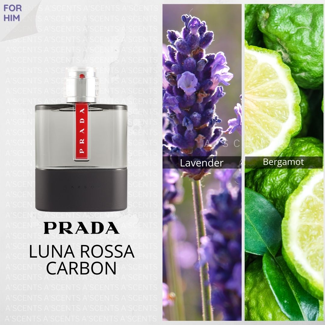 Prada Luna Rossa Carbon is a seductive, masculine fragrance, inspired by the collision of nature and technology. Steam-distilled botanicals mix with modern materials in a distinctive blend. A modern fougère, the scent features energetic notes of lavender, green bergamot from Italy, radiant woody notes of patchouli, and the dry amber of ambroxan.