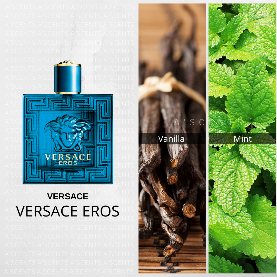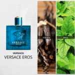 Eros interprets the sublime masculine through a luminous aura with an intense, vibrant, and glowing combination of fresh mint leaves, Italian lemon zest, and green apple. An addictive sensuality accented by oriental, intriguing, and enveloping notes like tonka beans, amrboxan amber, geranium flower, and vanilla melds with a racy virility symbolized by woods—such as cedarwood from Atlas and Virginia—while vetiver and oak moss provide intensity and power.