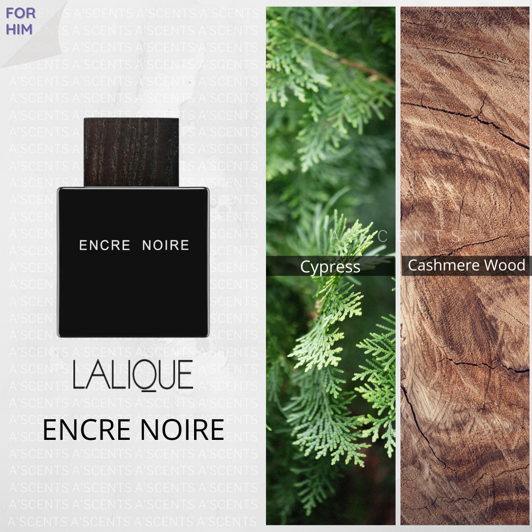 Encre Noire is a fragrance created in praise of wood. Its fresh and woody top notes come from the naturally aromatic cypress. Its stimulating core combines mysterious notes of vetiver, Bourbon and Haitian vetiver with the warm and enveloping notes of cashmere wood and musk.